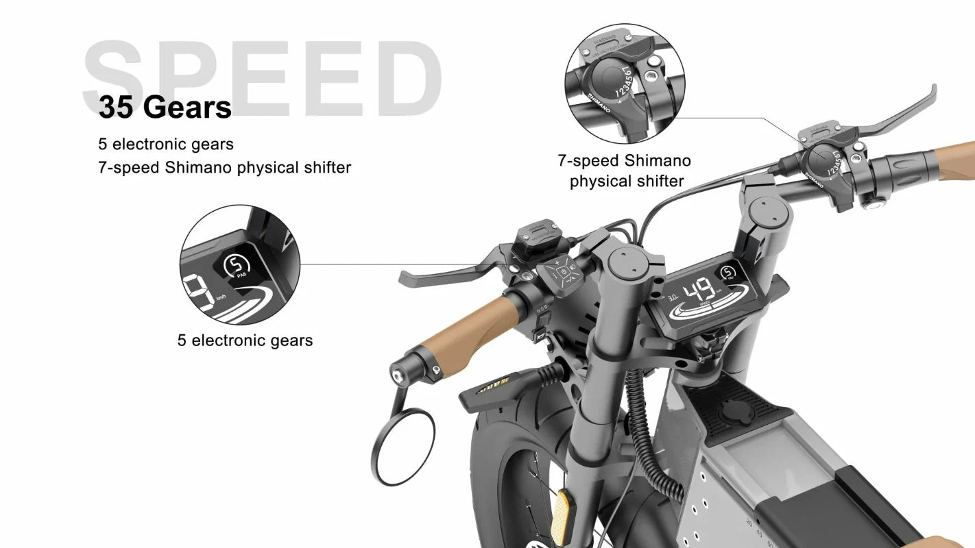 Gearbox: Font 5-speed electronic shifter x Rear Shimano 7-speed shifter