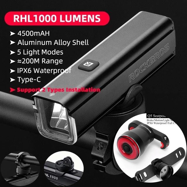 Rockbros RHL-1000 Lumens Q5 Smart Tail Light Front Rear Light Set Head Rear Light Bundle